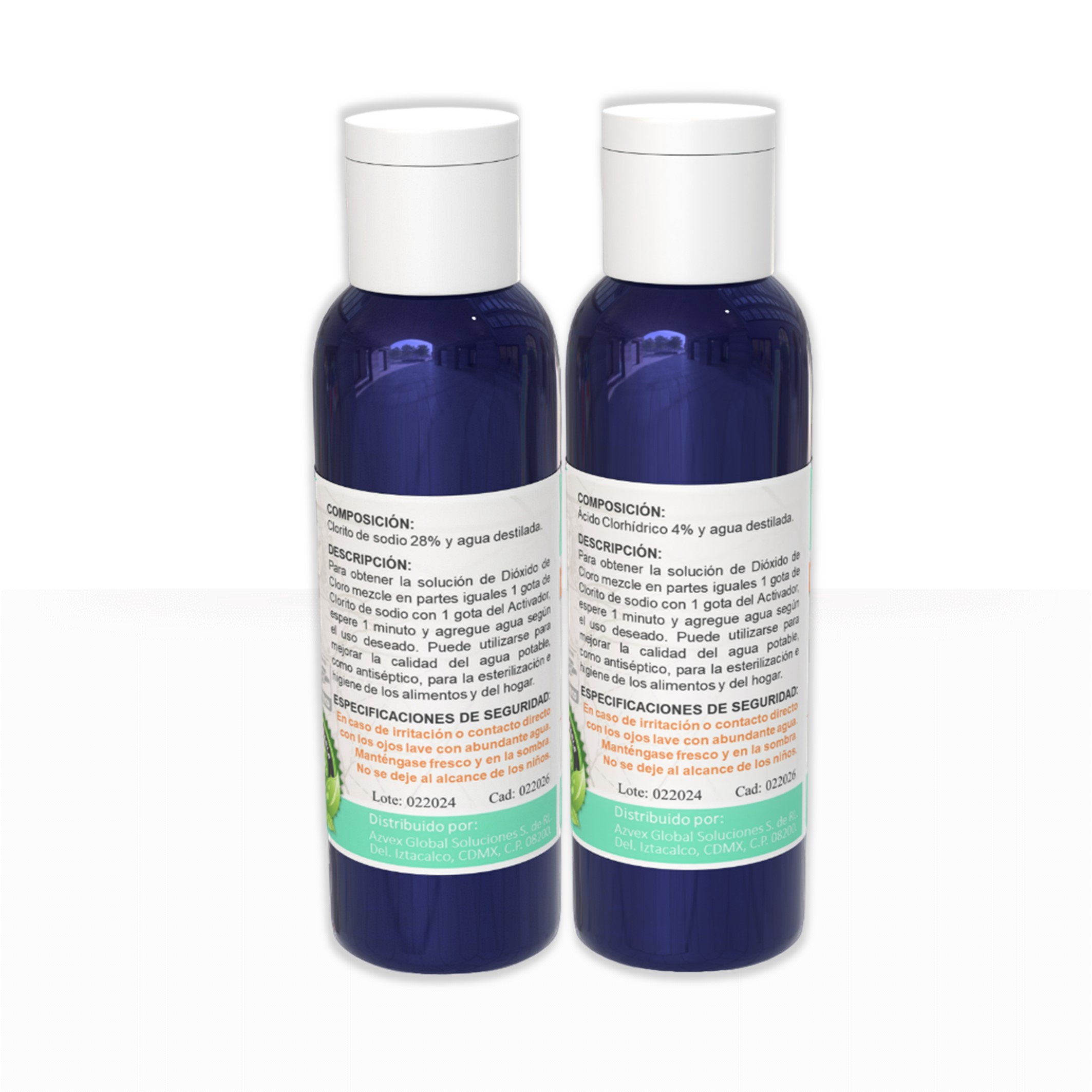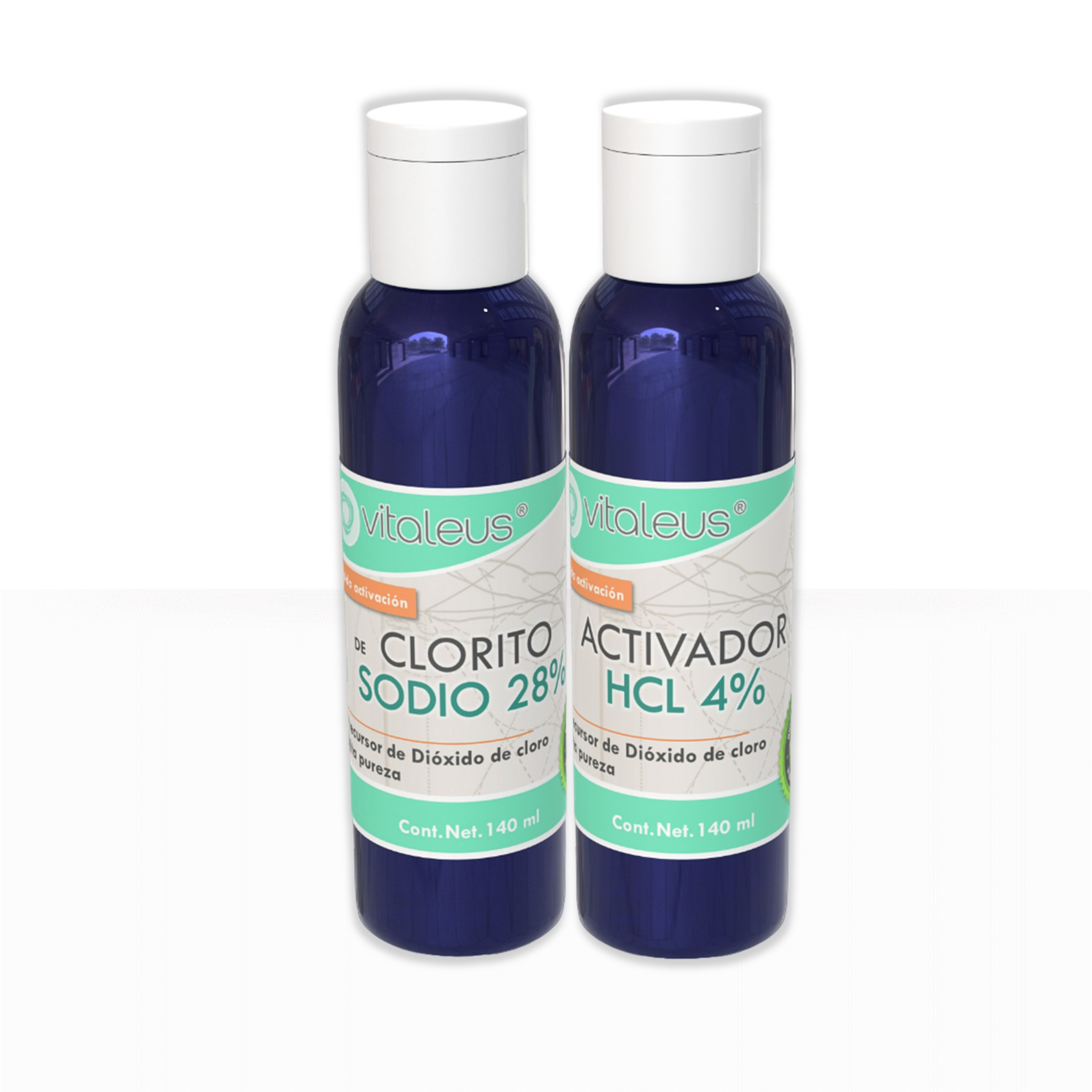 Clorito de sodio 28%, Acido Clorhídrico 4% y agua destilada